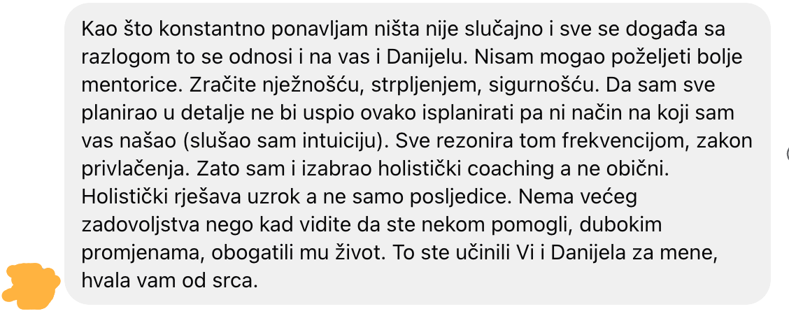 "Drage mentorice Danijela i Vanja, ne mogu pronaći dovoljno riječi kojima bih izrazila svoju zahvalnost za sve što ste mi pružile tijekom učenja. Vaša stručnost, predanost i toplina ne samo da su me obogatile znanjem, već su me nadahnule da se razvijam i napredujem i na profesionalnom i na osobnom planu. Zahvaljujući vašem vođenju i podršci, osjećam se spremno za svaki novi izazov i sigurna sam da ću s lakoćom primijeniti sve naučeno u svom radu. Vaša energija i ljubav prema onome što radite bili su pravi izvor inspiracije. Želim vam se od srca zahvaliti na predivnom iskustvu koje sam imala tijekom online programa certifikacije. Vaše vodstvo, podrška i stručno znanje pružili su mi priliku da rastem, učim i unaprijedim svoje vještine. Zahvaljujući vašem programu, osjećam se osnaženo i spremno za nove izazove u svojoj karijeri. Vaša predavanje bila su jasna, inspirativna i motivirajuća, a cijeli proces učenja bio je pravi užitak. Hvala što ste dijelile svoje znanje s tolikom strašću i predanošću."