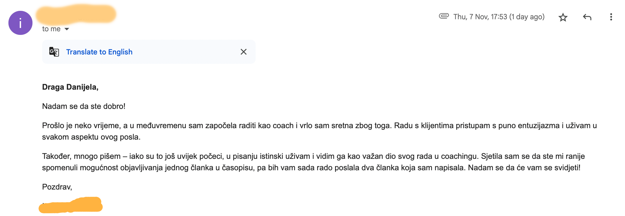 "Duboko vjerujem da se sve događa s razlogom i da sami kreiramo svoj put onda kada to odlučimo, onda kada smo spremni. Samo jedan pravi korak je dovoljan da taj put krene prema nama i Univerzum se osmjehne. Na taj način sam ja pronašla ‘Online Life Coaching Akademiju Ajna', sa najboljim i najsrdačnijim mentoricama Vanjom Beukelman Pavlović i Danijelom Jokić Vaislay. Uživam u svakom osmišljenom modulu koji na inspirativne načine, putem praktičnih vježbi i metoda, budi Life Coach-a u meni. Najviše me raduju praktične vježbe, jer ni sve teorije svijeta ne koriste ako ih ne znamo primijeniti i time nešto promijeniti. Na moje veliko iznenađenje i radost, počela sam zarađivati novac life coachingom i prije nego sam dobila certifikat, tokom praktičnog rada sa klijentima! Hvala vam, Vanja i Danijela, što dijelite svoje znanje i ljubav za dobrobit svih nas. I zato sam rekla 'DA upravo Akademiji Ajna!"